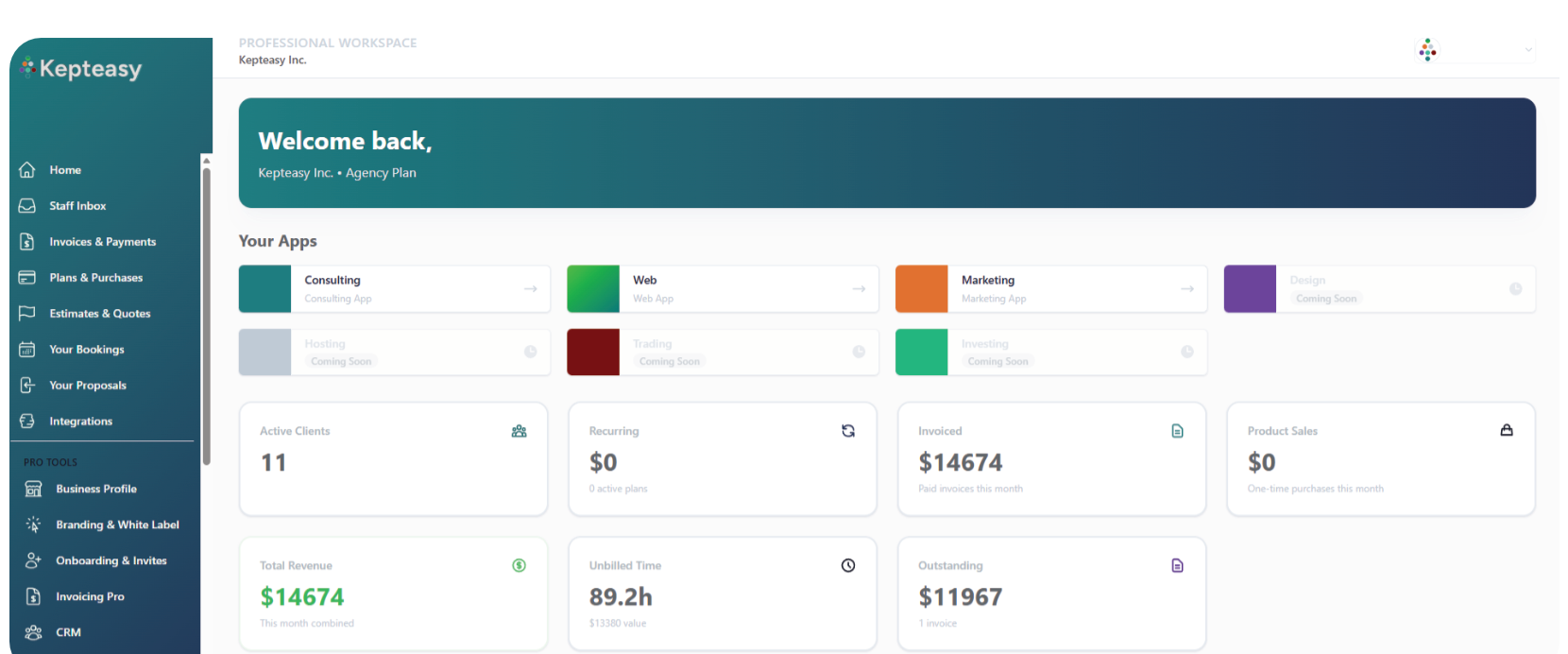 >Everything connected. Everything in one place. Built to support how professionals actually operate across consulting, web, and marketing.