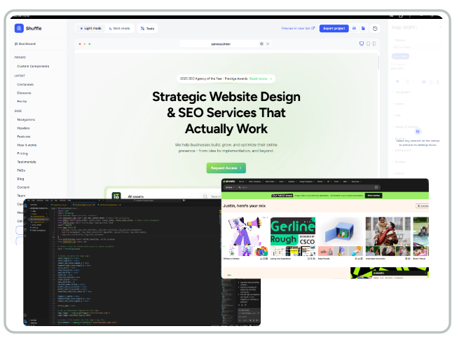 Django, Python, Tailwind, Shuffle, VS Code, Git, WordPress, Shopify, and other build tools are used depending on the project, budget, complexity, and long-term needs.